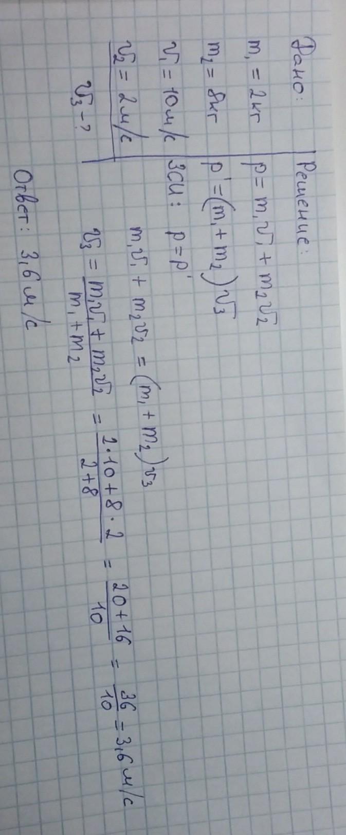 Два шара массами 2 кг и 8 кг двигаются навстречу друг другу со скоростями соответственно 10м/с и 2м/с соответственно. С какой скоростью они будут продолжать движение после неупругого удара.
