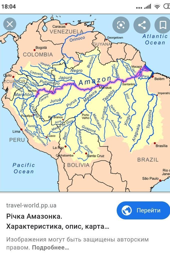Ріка приймає близько 500 приток, багато з яких – величезні ріки: близько 20 приток мають протяжність понад 1,5 тис. км. Найбільші праві притоки – Укаялі, Журуа, Мадейра, Тапажос, Шингу; ліві – Іса, Япура, Ріу-Негру. Впадаючи, одна за іншою, багатоводні притоки швидко збільшують ширину річки; після злиття з Укаялі Амазонка має ширину близько 1,5 км, в середній течії – до 5 км, перед гирлом – від 80-до 150 км. Перед впадінням в Атлантичний океан русло Амазонки розбивається між великими островами на рукави, утворюючи воронкоподібні гирла.
