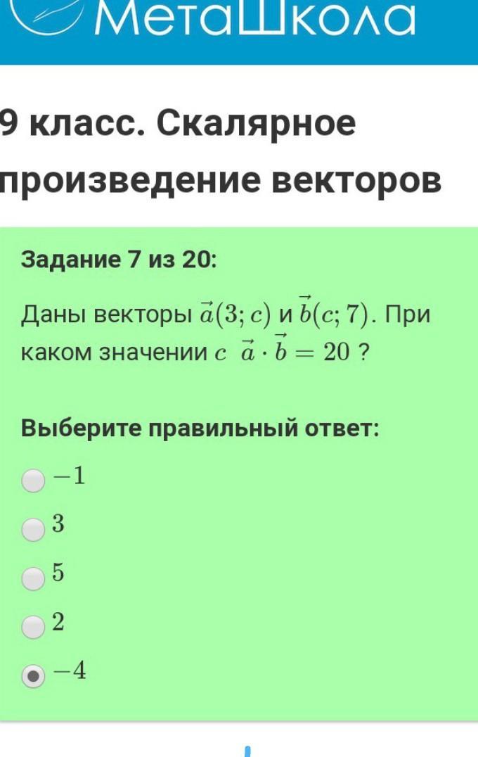 Дано: a(3;c) и b(c;7). a*b=20