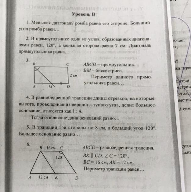 1.Если малая диагональ ромба равна стороне, то она является стороной равностороннего треугольника, один угол которого - это острый угол ромба. А так как углы равностороннего треугольника равны 60 градусов, то острый угол ромба равен 60 градусов. Так как, углы ромба, прилегающие к любой тороне в сумме равны 180 градусов, то больший угол равен 180 - 60 = 120 градусов.