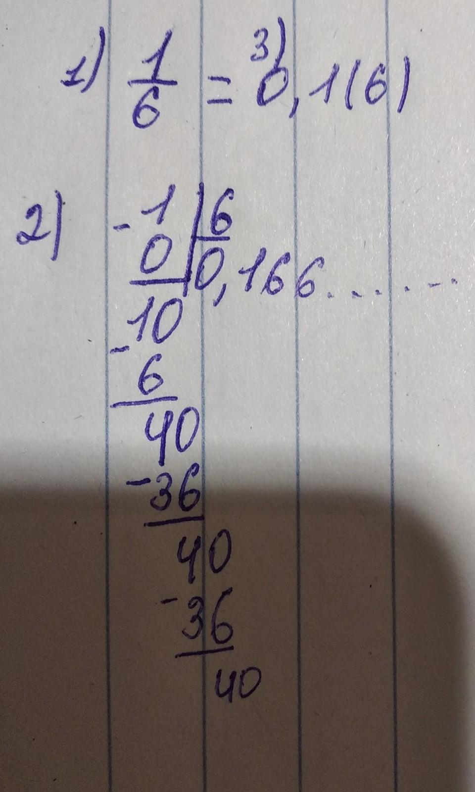 сначало мы делим 1 на 6 (проще сказать мы всегда делим число которое сверху на нижние число ) что бы получить периодическую дробь