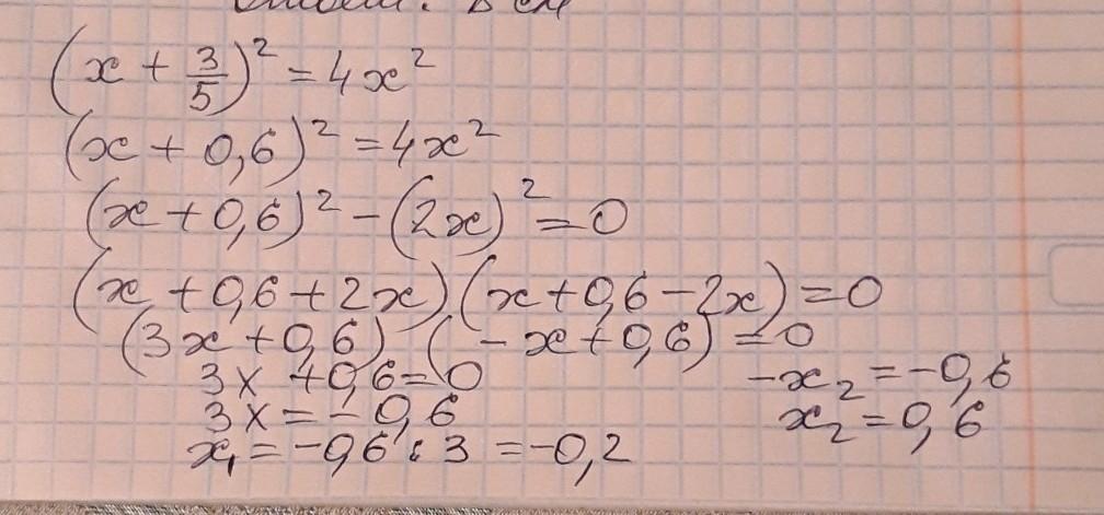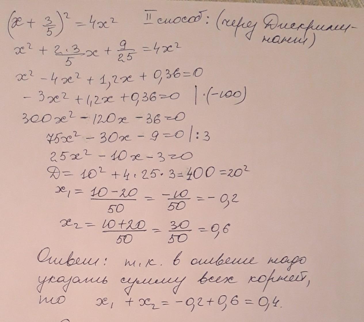 (x+3/5)^2=4x^2 найдите корень уравнения. В ответе укажите сумму всех различных действительных корней данного уравнения.