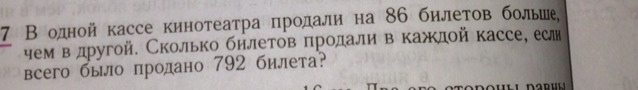 Пусть в одной кассе продали "х" билетов,а в другой (х+86) билетов. Известно,что всего билетов было продано 792. Составлю уравнение: