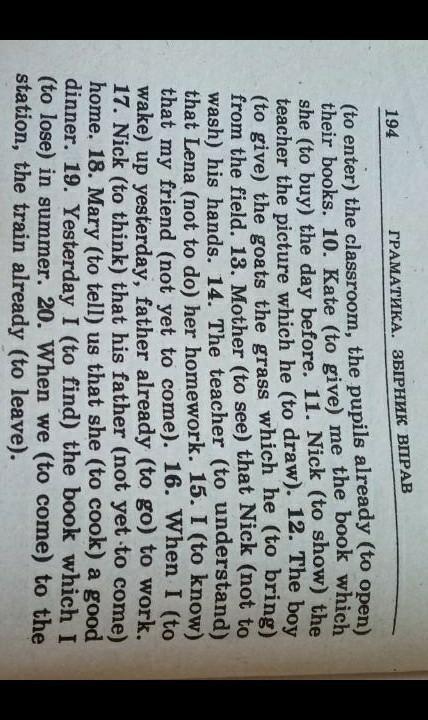 . The teacher entered, the pupils had already opened. 10. Kate gave, she had bought. 11. Nick showed, he had drawn. 12. The boy gave, he had brought. 13. Mother saw, Nick had not washed. 14. The teacher understood, Lena had not done. 15. I knew, my friend had not yet come. 16. I woke, father had already gone. 17. Nick thought, his father had not yet come. 18. Mary told, she had cooked. 19. I found, I had lost. 20. We came, the train had already left.