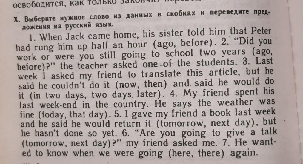 1. Когда Джек пришел домой, его сестра сказала ему, что Питер позвонил ему полчаса (назад, до того). 2. «Вы работали или вы еще ходили в школу два года назад?» учитель спросил одного из учеников. 3. На прошлой неделе я попросил моего друга перевести эту статью, но он сказал, что не может этого сделать (сейчас, тогда) и. сказал, что сделает это (через два дня, через два дня. позже). 4. Мой друг провел свою последнюю поездку в стране. Он говорит, что погода была хорошая (сегодня, в тот день). 5. Я дал своему другу книгу на прошлой неделе, и он сказал, что вернет ее (завтра, на следующий день), но он еще этого не сделал. 6. «Собираетесь ли вы выступить (завтра, на следующий день)?» мой друг спросил меня. 7. Он хотел знать, когда мы собирались (здесь, там) снова.