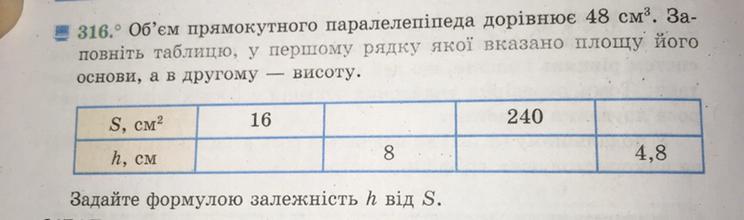 Об‘єм прямокутного паралелепіпеда = 48см3. Заповніть таблицю у першому рядку якої вказано площу його основи, а в другому - висоту.