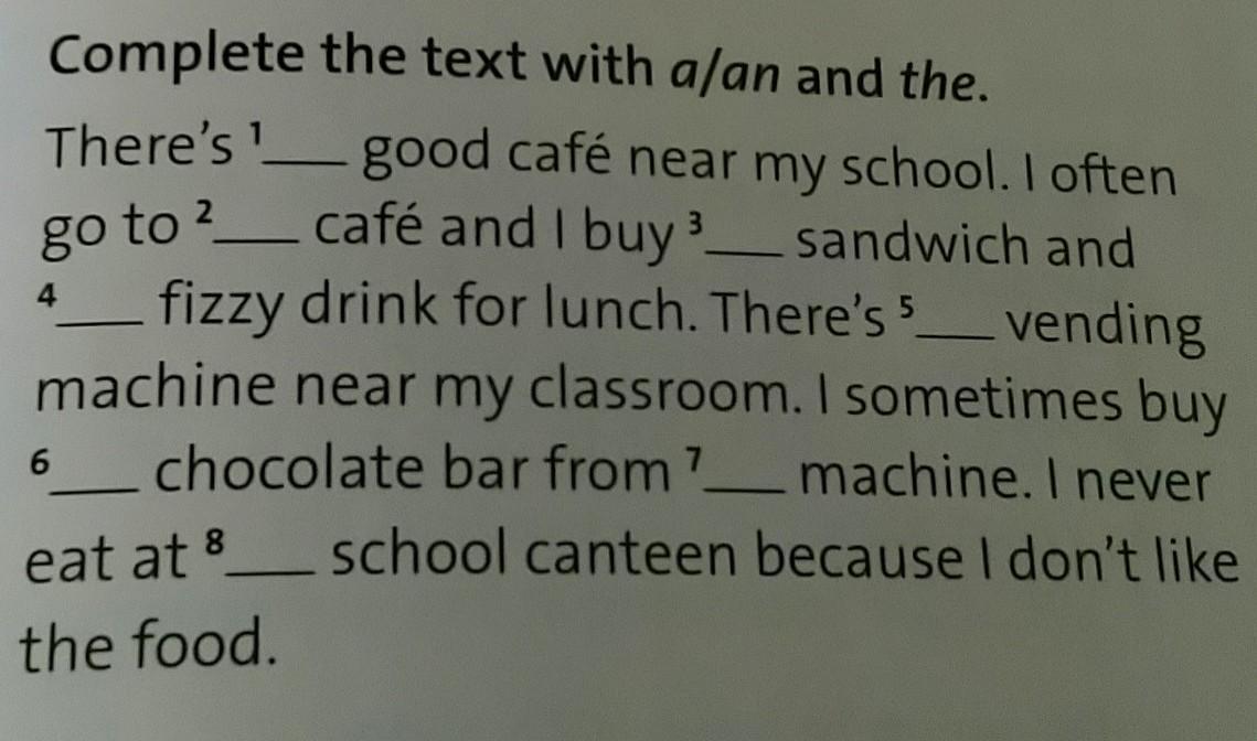 There's a good café near my school. I often go to the café and I buy a sandwich and a fizzy drink for lunch. There's s a vending machine near my classroom. I sometimes buy a chocolate bar from the machine. I never eat at the school canteen because I don't like the food.