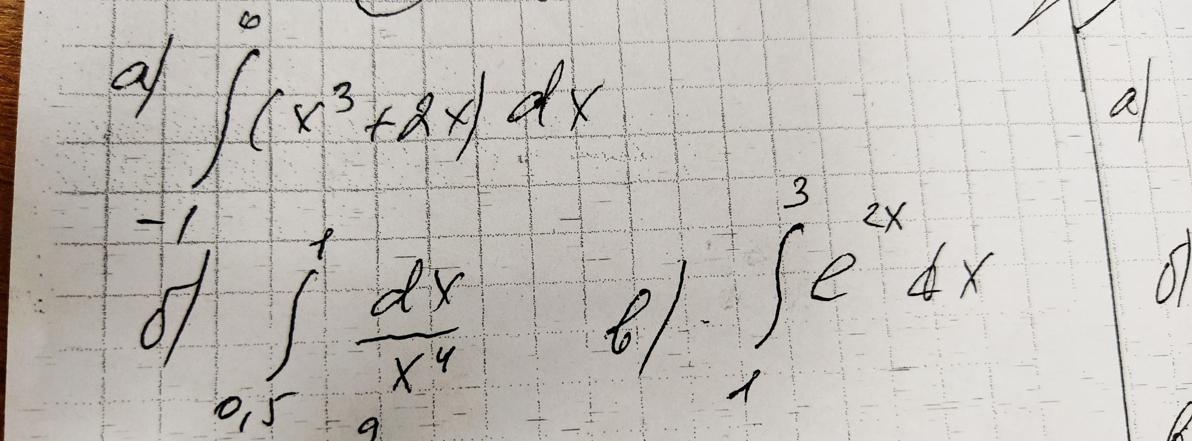 \int\limits^0_{-1}(x^3+2x)\,  dx=(\frac{x^4}{4}+2\cdot \frac{x^2}{2})\Big |_{-1}^0=0-(\frac{1}{4}+1)=-1,25\\\\\\\int\limits^1_{0,5}\, \frac{dx}{x^4}=\frac{x^{-3}}{-3}\Big |_{0,5}^1=-\frac{1}{3x^3}\Big |_{0,5}^1=-\frac{1}{3}\cdot (1-\frac{1}{0,125})=-\frac{1}{3}\cdot (1-\frac{1000}{125})=\\\\=-\frac{1}{3}\cdot (1-8)=\frac{7}{3} \\\\\\\int\limits^3_1\, e^{2x}\, dx=\frac{1}{2}\cdot e^{2x}\Big |_1^3=\frac{1}{2}\cdot (e^6-e^2)=\frac{e^2}{2}\cdot (e^4-1)