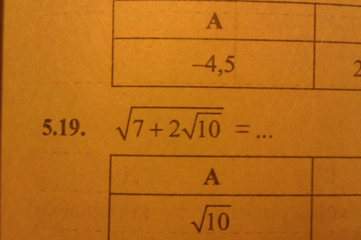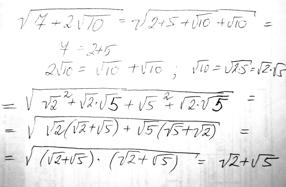 7 = 2 + 5 = √2^2 + √5^2 2√10 = √10 + √10 Получается под корнем 4 слагаемых, которые мы группируем по два: √2^2 + √10 и √5^2 + √10 а потом , учитывая что √10 = √2*5 = √2*√5 из каждой группы выносим общий множитель. √2^2 + √10 = √2^2 + √2*√5 = √2(√2 + √5 ) и √5^2 + √10 = √5^2 + √2*√5 = √5(√5 + √2 ) = √5(√2 + √5 ) А дальше выносим еще раз общий множитель (√2 + (√5 ), и остается в скобках (√2 + √5 ), т.е под корнем получился квадрат числа √2+√5