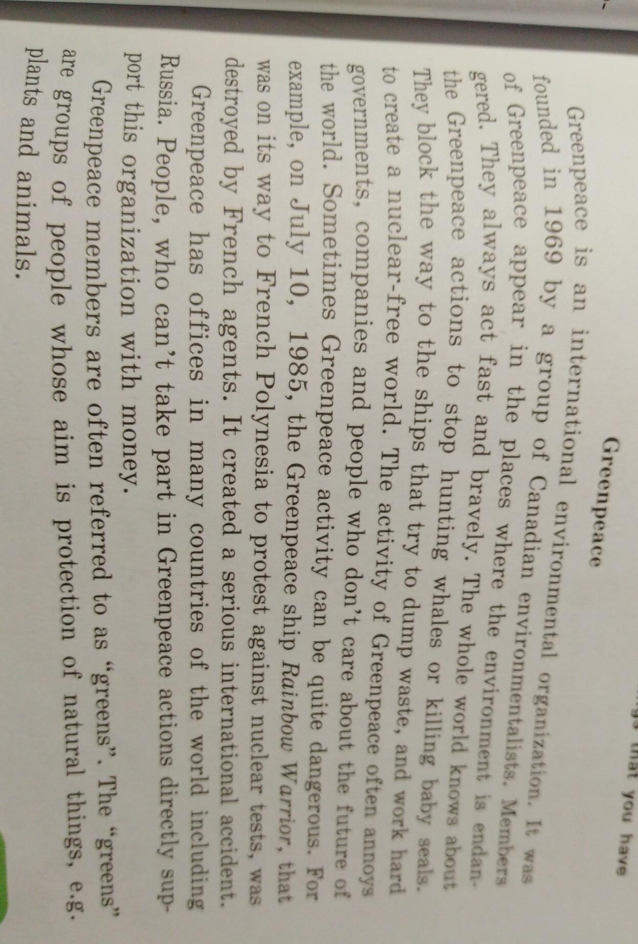 Greenpeace - международная экологическая организация. Он был основан в 1969 году группой канадских экологов. Члены Гринпис появляются в местах, где окружающая среда находится под угрозой. Они всегда действуют быстро и смело. Весь мир знает о действиях Гринписа по прекращению охоты на китов или убийства тюленей. Они блокируют путь к судам, которые пытаются сбрасывать отходы, и усердно работают над созданием безъядерного мира. Деятельность Гринпис часто раздражает правительства, компании и людей, которым нет дела до будущего мира. Иногда деятельность Гринпис может быть довольно опасной. Например, 10 июля 1985 года французские агенты уничтожили корабль «Гринпис» «Радужный воин», который направлялся во Французскую Полинезию в знак протеста против ядерных испытаний. Это создало серьезную международную аварию. Гринпис имеет офисы во многих странах мира, включая Россию. Люди, которые не могут участвовать в действиях Гринпис, напрямую поддерживают эту организацию деньгами. Члены Гринпис часто называют «зелеными». «Зеленые» - это группы людей, целью которых является защита естественных вещей, например, растения и животные.