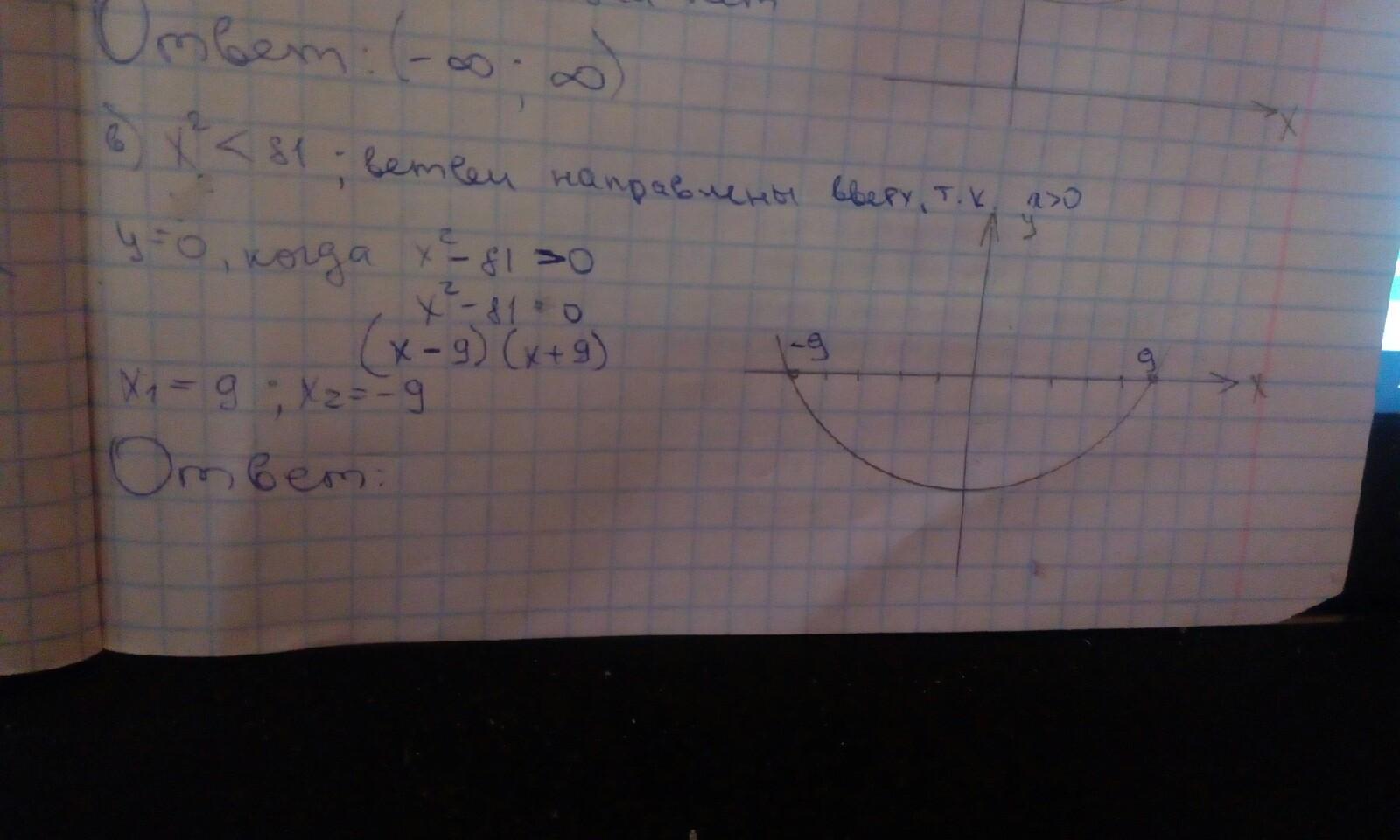 Так оно же задано! в этом примере конкретно (х²-81)=у<0. Решаем, т.е. находим корни х1=9, х2=-9, значит данное неравенство имеет вид (х-9)•(х+9) <0 -скобки разного знака, что возможно если х>-9, х<+9. Это и есть интервал значений х, при которых исходное неравенство выполняется. Он автоматически получился единственный, согласно условию.