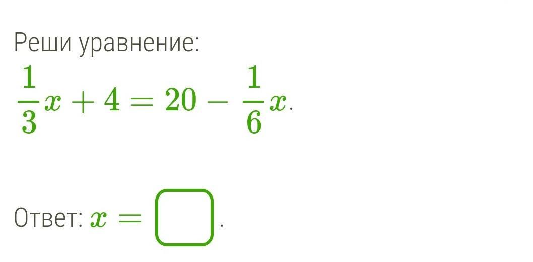 1/3 x + 4 = 20 - 1/6x <=> 1/3x+1/6x=20-4 <=> 0,5x=16 <=> x=32