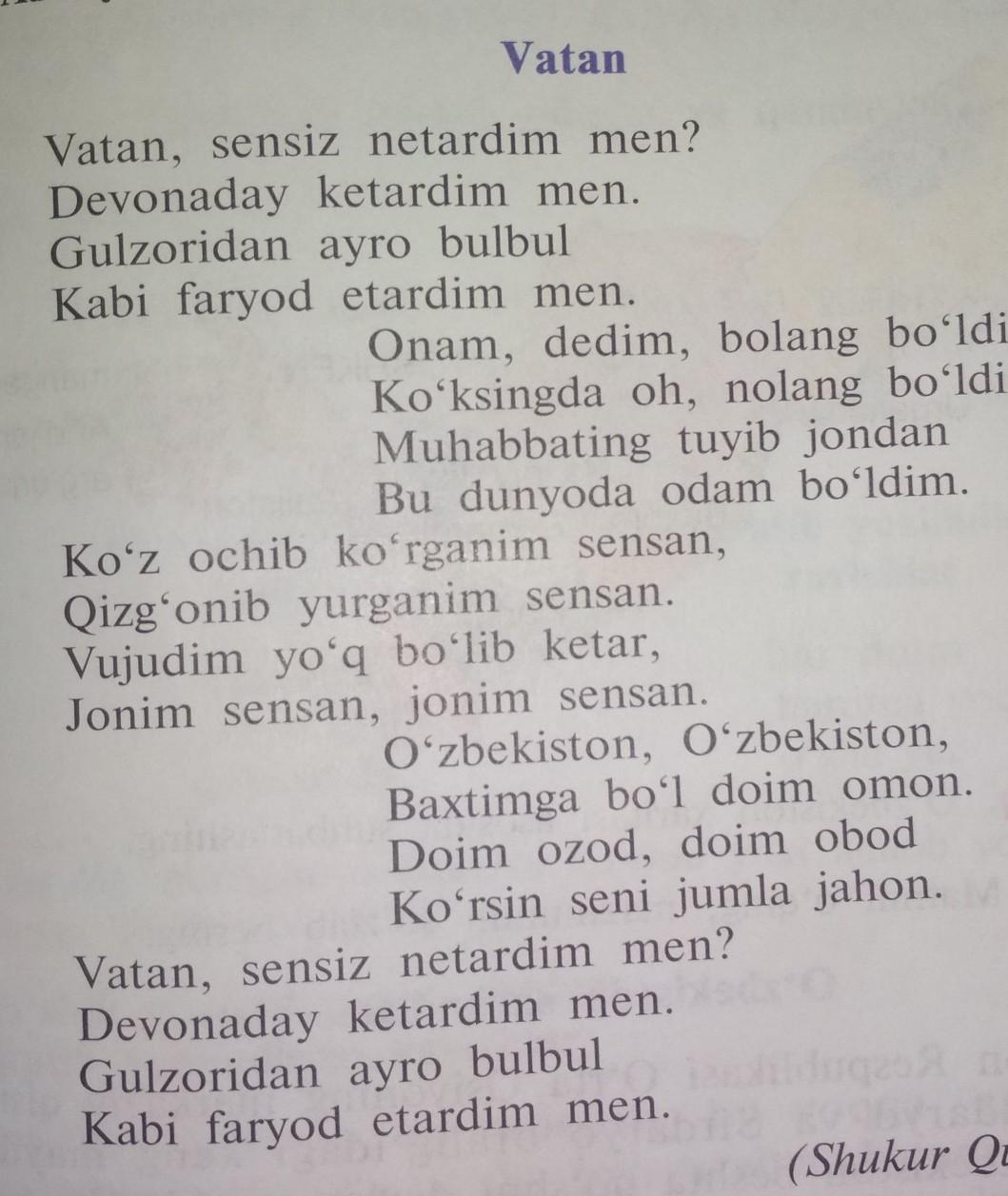 11:31 ... 30,5 K5 / c. 82% Родина, я имею в виду без тебя? Я бы пошел как Девона. Я плакал, как соловей из розы. Мама, я сказал, твой ребенок был в твоем сердце О, это был вздох любви. Ты Тот, кто открыл мне глаза, и я ревную. Я не буду существовать. Ты моя душа, ты моя душа. Узбекистан, Узбекистан, я всегда счастлив. Всегда свободен, всегда процветающий, Пусть мир говорит. Родина, я бы без тебя? Я бы пошел как Девона. Я плакал, как соловей из розы.