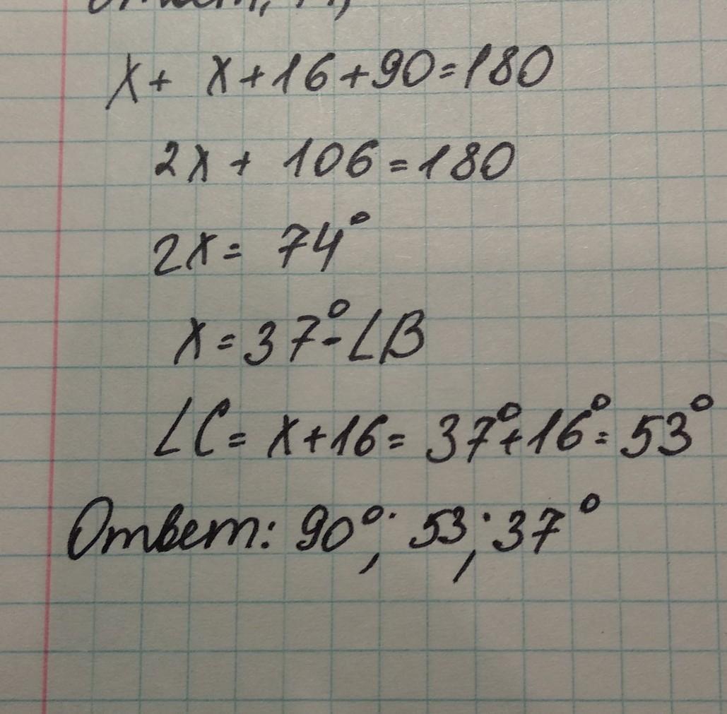 помоготе пожалуйста:Один из углов прямоугольного треугольника больше другого на 16 градусов Чему равны углы этого треугольника