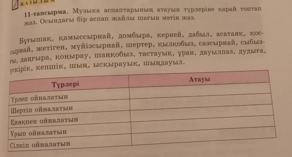 Үрлеп ойналатын:Сазсырнай,сыбызғы,үскірік,мүйізсырнай,қамыссырнай,тастауық,бұғышық,керней,ұран,қоссырнай