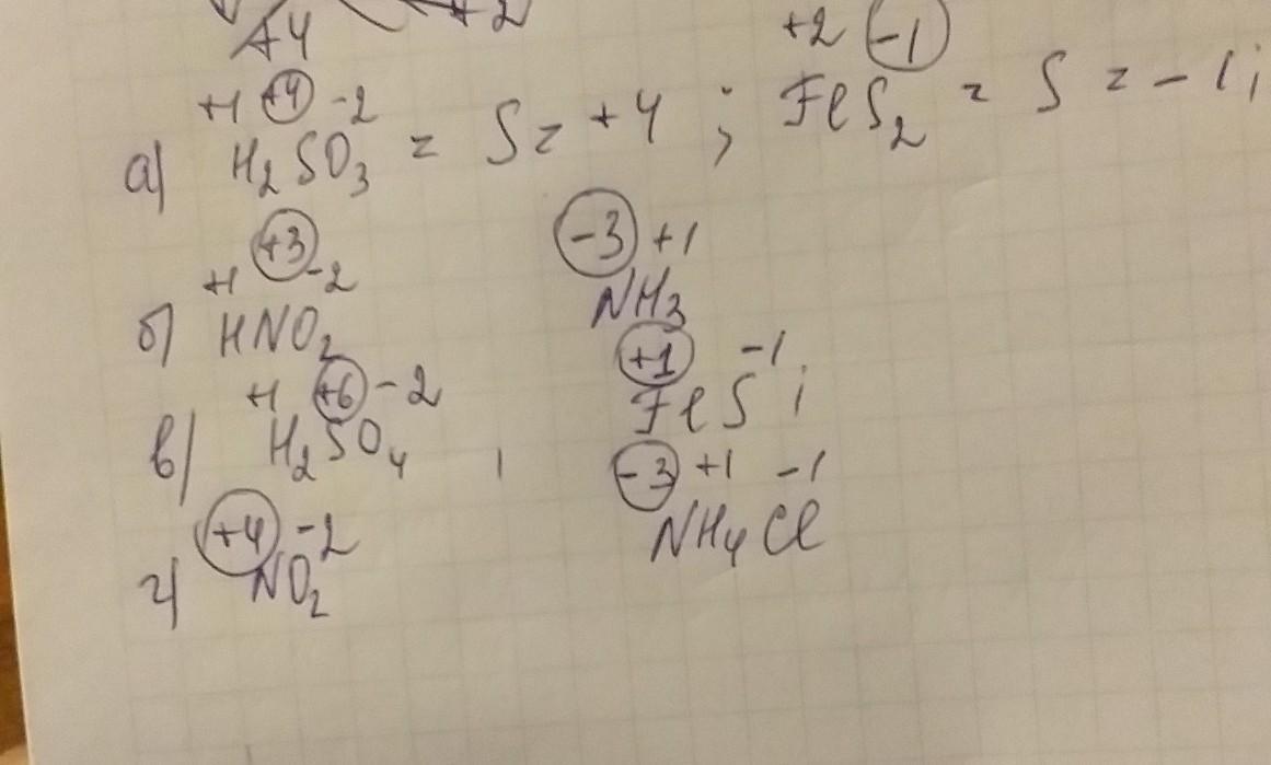 высшая и низшая степень окисления одного и того же элемента представлены в соединениях формулы которых а) H2SO3 FeS2. б) HNO2 NH3 В) H2SO3. FES. г) NO2 NH4CI