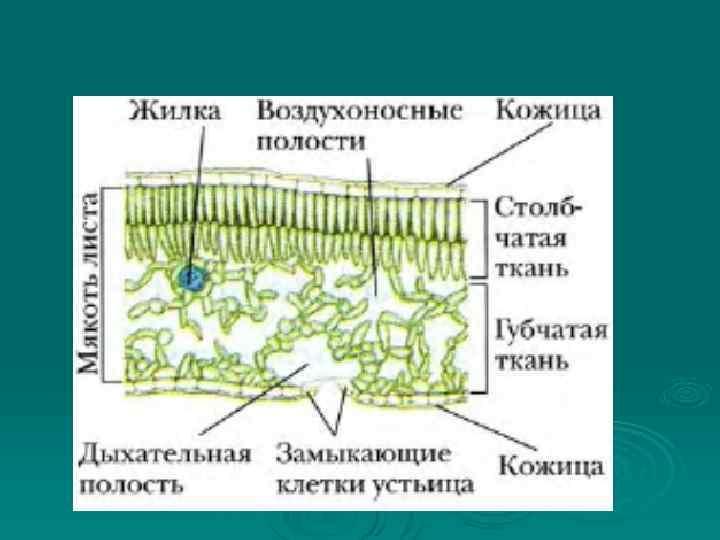 1) Столбчатая ткань - основная ткань листа, клетки которой имеют цилиндрическую форму, плотно прилегают друг к другу и расположены с верхней стороны листа, обращенной к свету. Столбчатая ткань служит для фотосинтеза.
