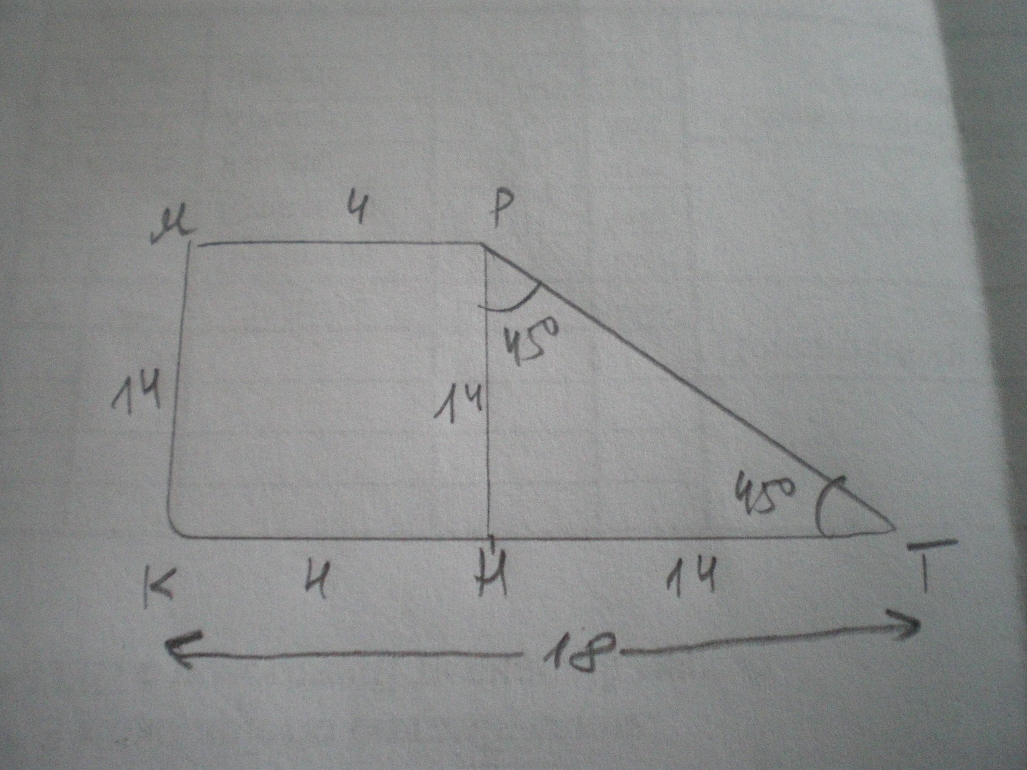 Решение: проведем высоту РН=МК=14 см, рассмотрим ΔНРТ - прямоугольный, ∠Т=45°, тогда и ∠ТРН=90-45=45°, а ΔНРТ - равнобедренный, РН=ТН=14 см