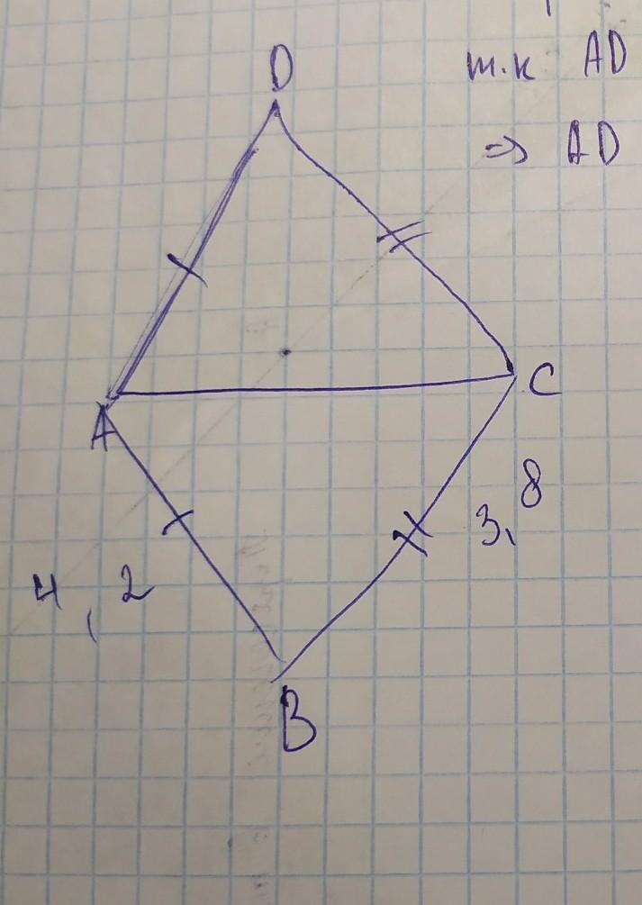 Докажите равенство треугольников ADC и ABC, если AD=AB и DC=BC. Найдите стороны AD и DC , если AB=4,2 см , BC=3,8 см