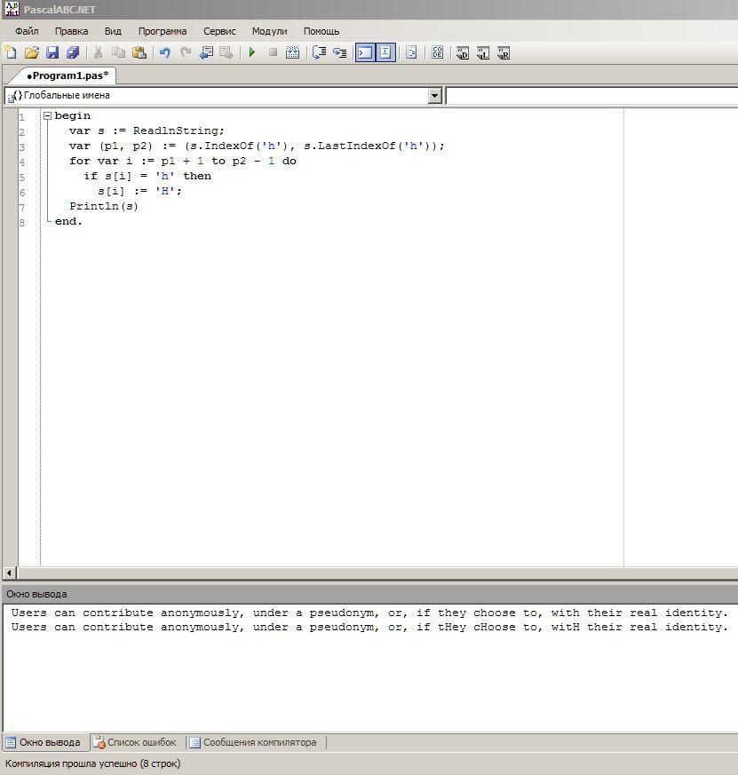 Дана строка. Замените в этой строке все появления буквы h на букву H, кроме первого и последнего вхождения.