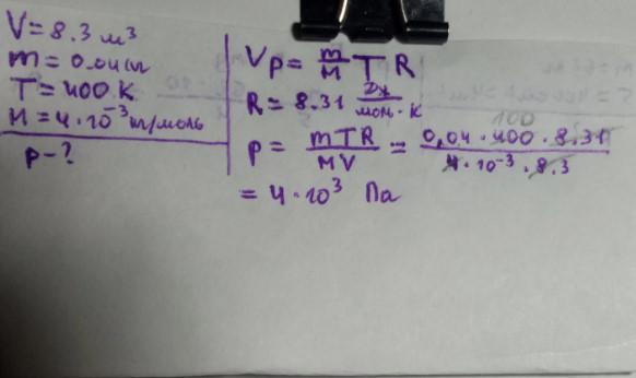 в сосуде обьемом 8,3м³ находится 0,04 кг гелия при температуре 127 градусов.Определите его давление.с дано и решением.