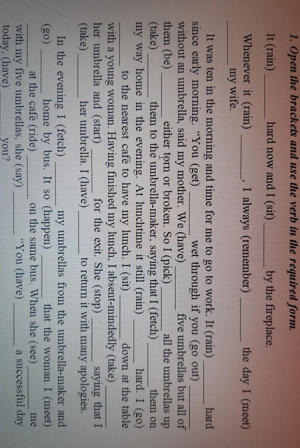 It (is raining) hard now and I (am sitting) by the fireplace. Whenever it (rains), I always (remember) the day I (met) my wife. It was ten in the morning and time for me to go to work. It (had been raining) hard since early morning. "You (will get) wet through if you (go out) without an umbrella, said my mother. We (had) five umbrellas but all of them (were) either torn or broken. So I (picked) all the umbrellas up (took) them to the umbrella-maker, saying that I (would fetch) them on my way home in the evening. At lunchtime it was still (raining) hard. I (went) to the nearest cafe to have my lunch. I (sat) down at the table with a young woman. Having finished my lunch. I absent-mindedly (took) her umbrella and (started) for the exit. She (stopped) me saying that I (had taken) her umbrella. I (had) to return it with many apologies. In the evening I (fetched) my umbrellas from the umbrella-maker and (went) home by bus. It so (happened) that the woman I (had met) at the cafe (was riding) on the same bus. When she (saw) me with my five umbrellas. she (said) "You (have had) a successful day today, (haven't) you?