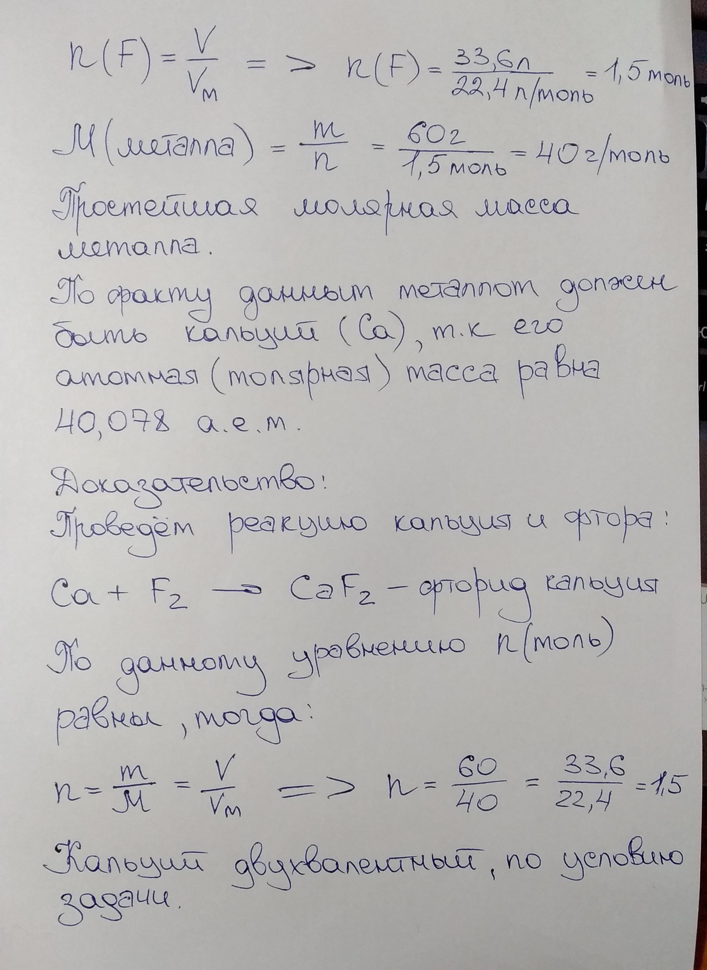 Двухвалентно неизвестный металл массой 60 г взаимодействовал с фтором 33,6 л(фтор). Определите металл, участвовавший в реакции