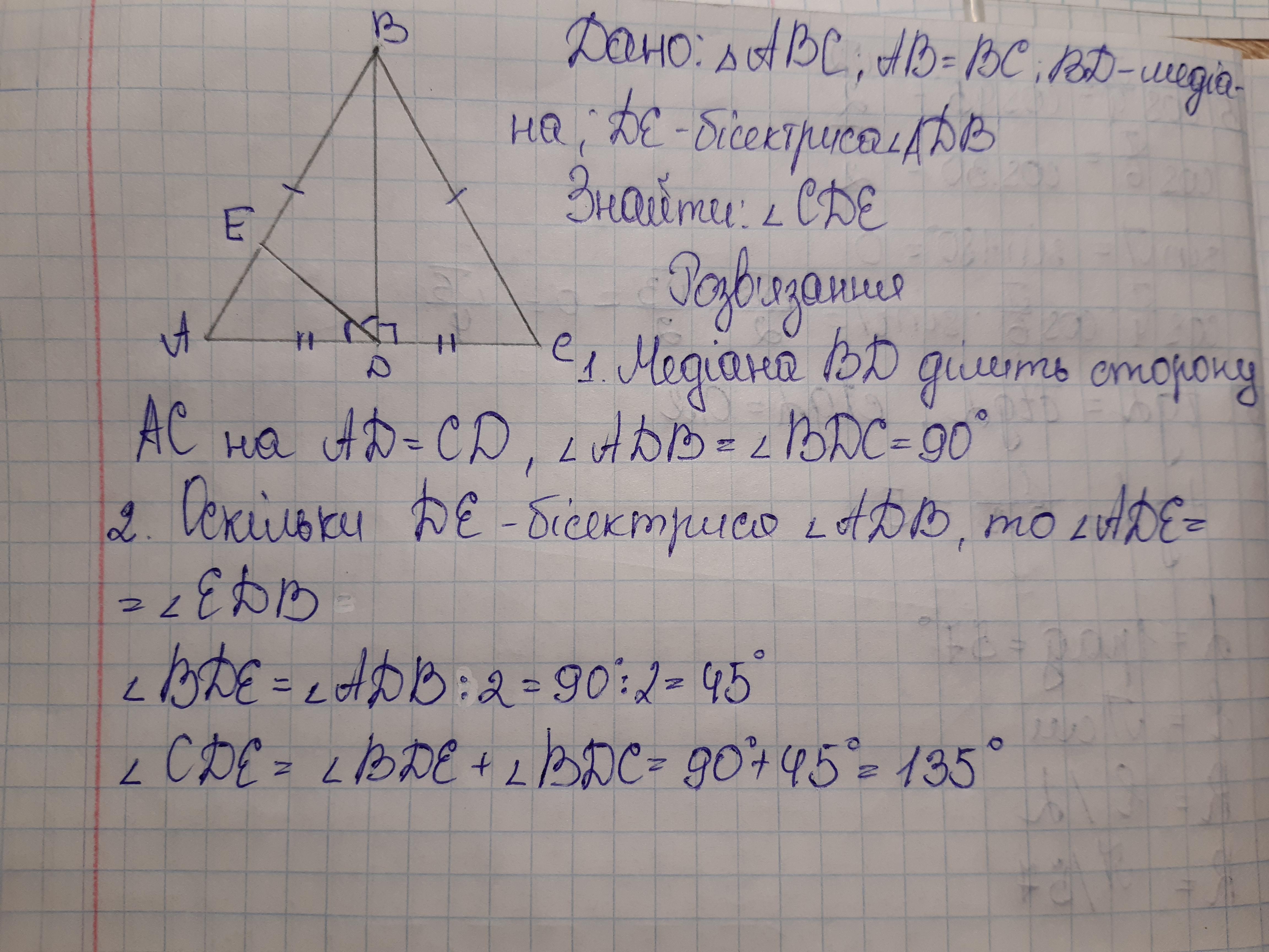ПОМОГИТЕ РЕШИТЬ!!! У рівнобедреному трикутнику ABC з основою AC проведена медіана BD, а в трикутнику ABD – бісектриса DE. Знайдіть градусну міру кута CDE