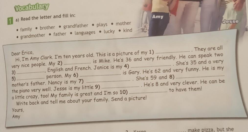 Ответ:1) Family 2) father 3) languages 4) mother 5) kind 6) grandfather 7) grandmother 8) plays 9) brother 10) lucky