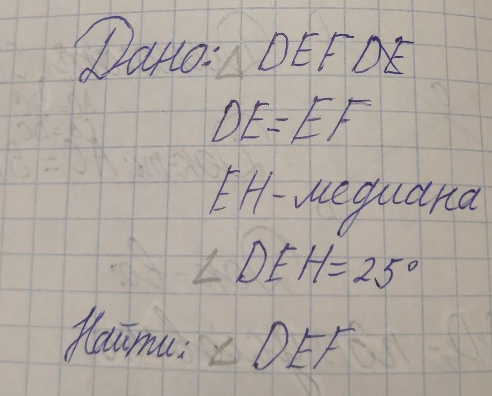 Т.к. DE=EF то треугольник равнобедренный. поэтому медиана EH будет и высотой и биссектрисой угла DEF. тогда получается что угол DEF=2*DEH=2*25=50