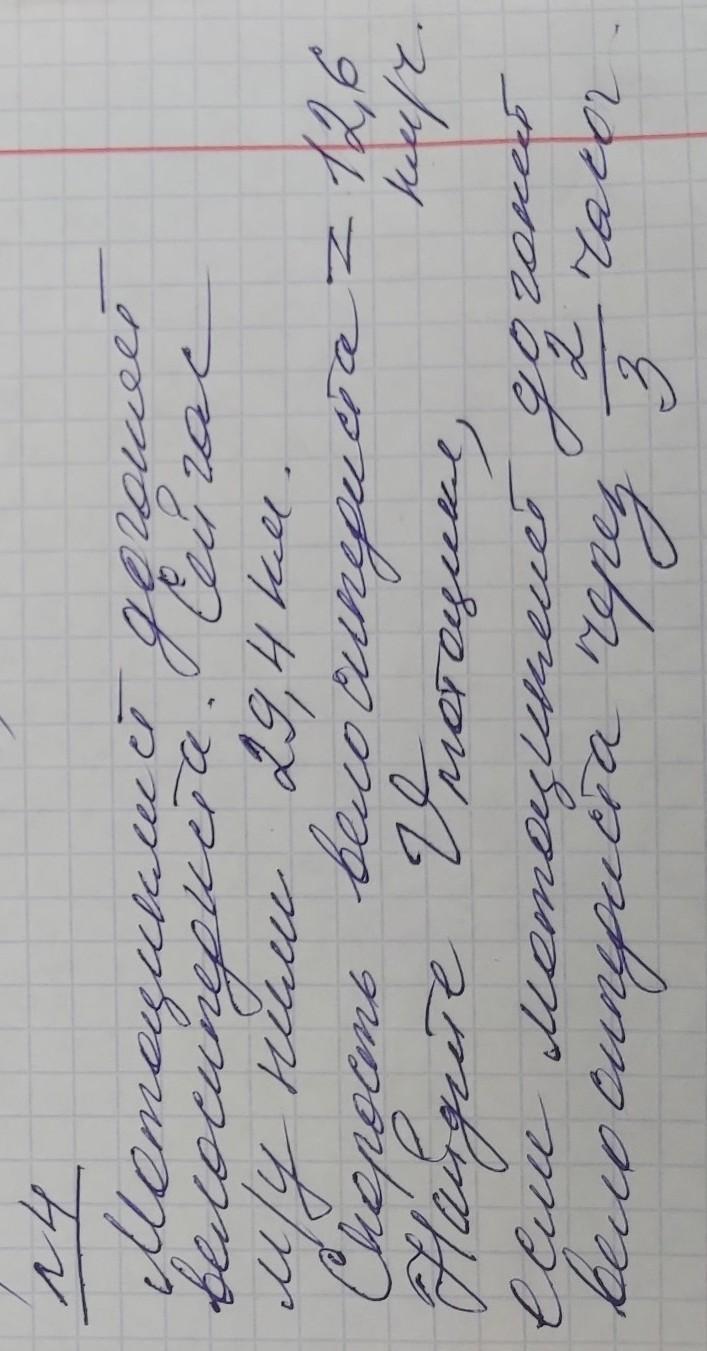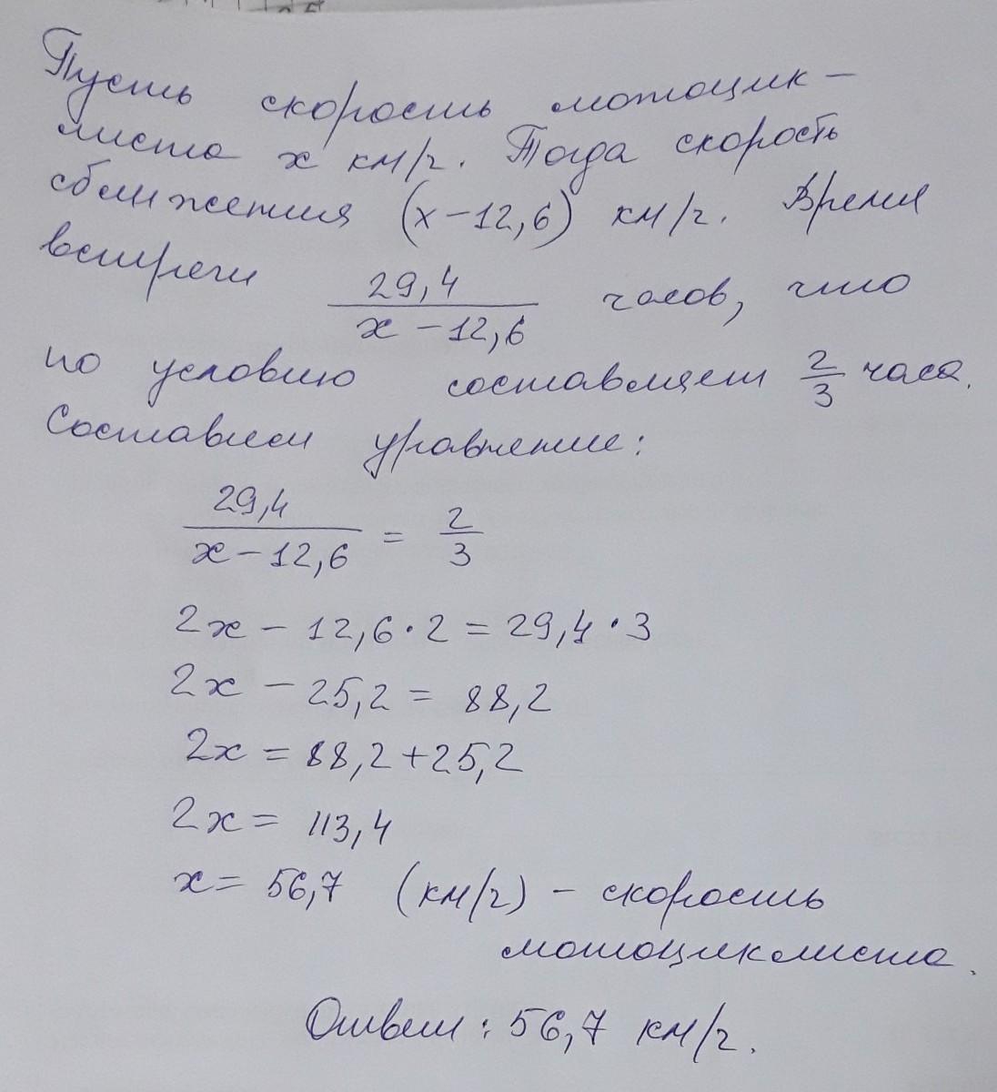 мотоциклист догоняет велосипедиста. сейчас между ними 29,4 км. скорость велосипедиста = 12,6 км.час. найдите скорость мотоциклиста, сели мотоциклист догнал велосипедиста через ⅔ часа