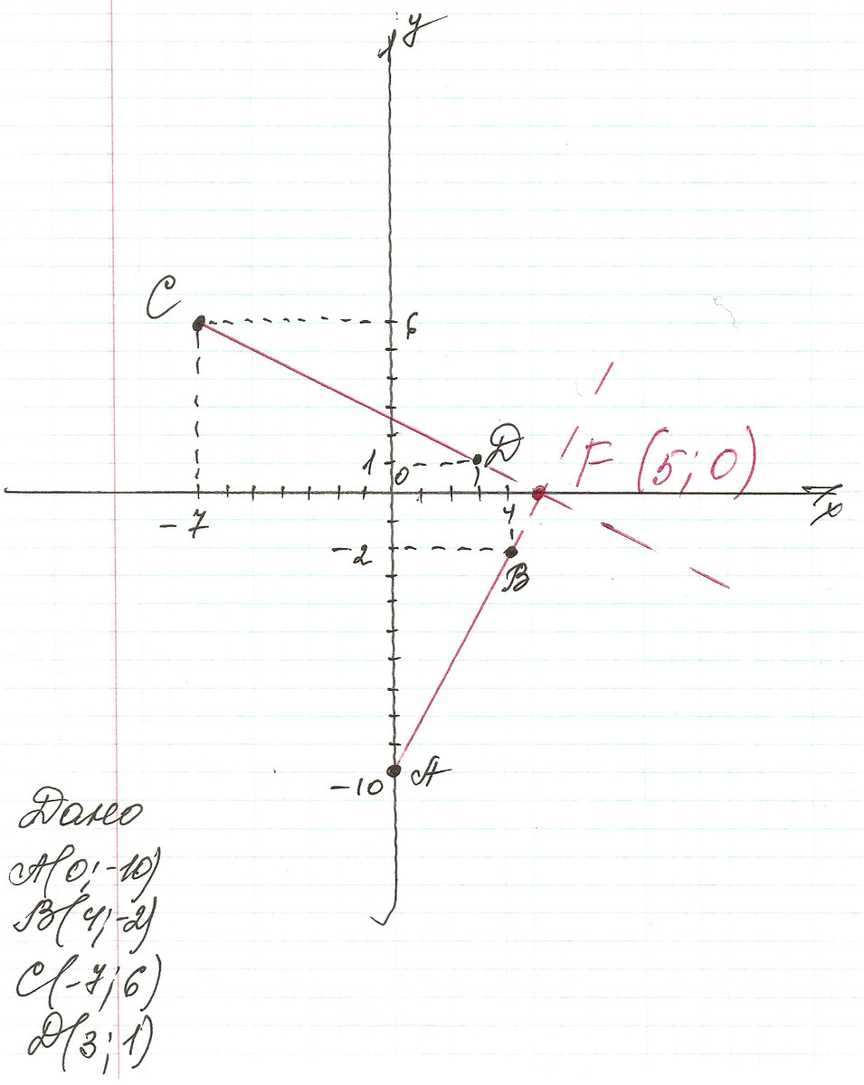 Отметьте на координатной плоскости точки А(0;-10),В(4;-2),С(-7;6),D(3;1) запишите координаты точки пересечения прямой AB и луча CD.