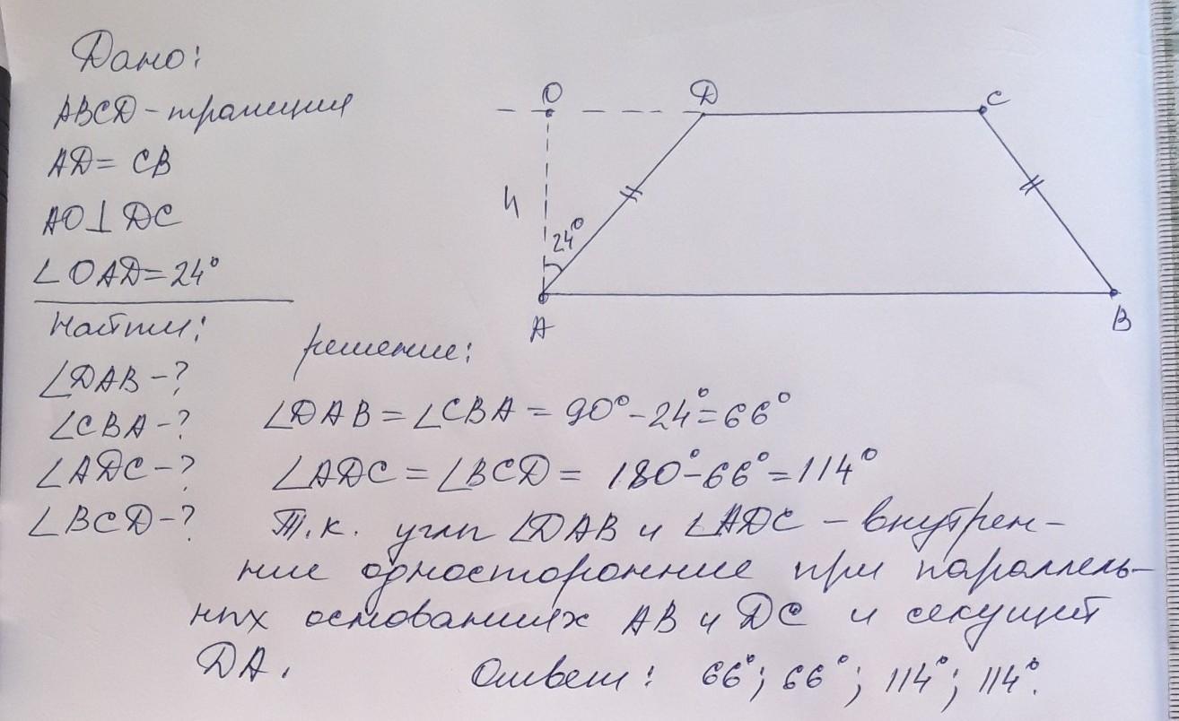 Висота рівнобічної трапеції проведена з вершини гострого кута утворює з бічною стороною кут 24° Знайдіть кути трапеції.