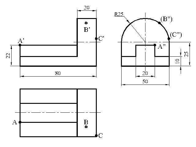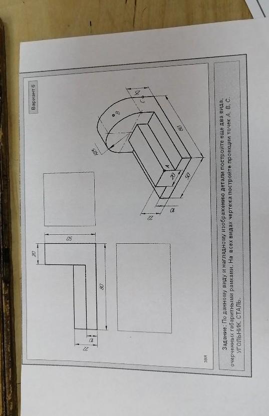 по данному виду и наглядному изображению детали постройте еще два вида очерченных габаритными рамками. На всех видах чертежах постройке проекцию точек А, В, С. Угольник. Сталь.