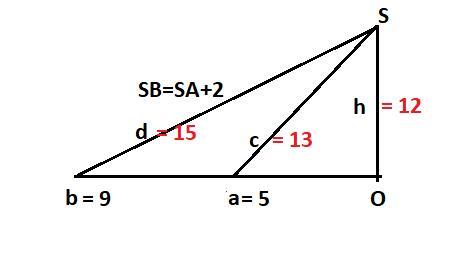 Із точки до площини проведенно дві похилі. Знайти довжину похилих, якщо одна із них на 2см менша від другої а проекції дорівнюють відповідно 5 см і 9 см