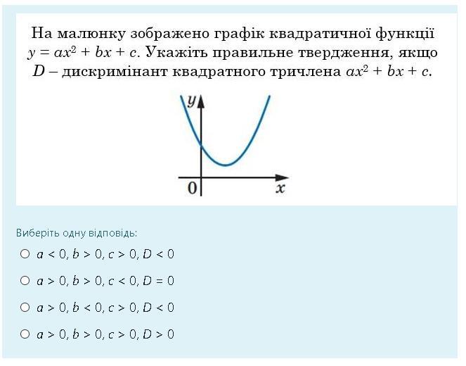 Ответ : a > 0 , b < 0 , c > 0 , D < 0