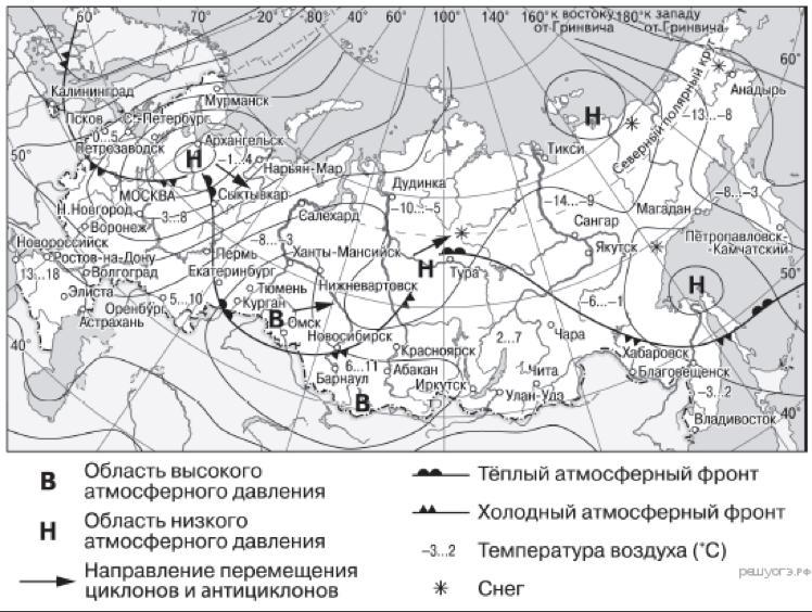 перечисленных населённых пунктов, показанных на карте, находится в зоне действия антициклона? 1) Мурманск 2) Новосибирск 3) Тикси 4) Магадан