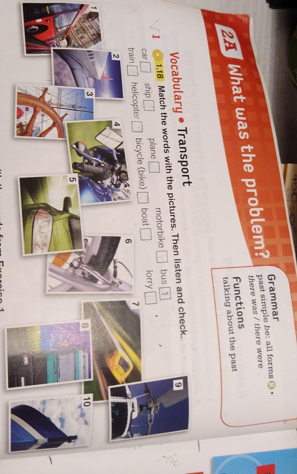 Car 5 ,ship 10 ,plane 2, motorbike 4, train 7 , helicopter 9 , bicycle 6 ,boat 3, lorry 8