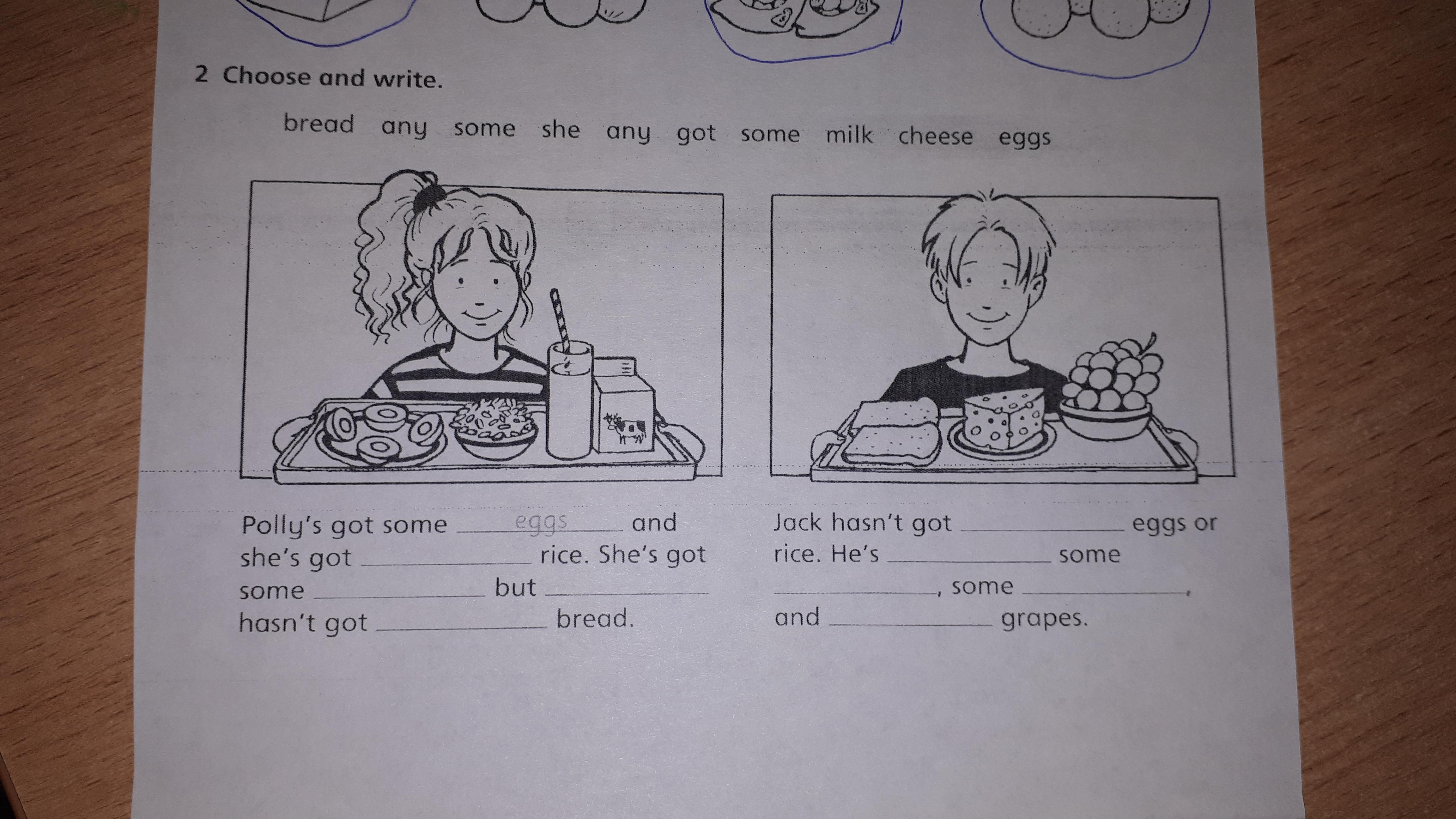polly's got some eggs and she's got boiled rice. she's got some milk but hasn't piece of bread