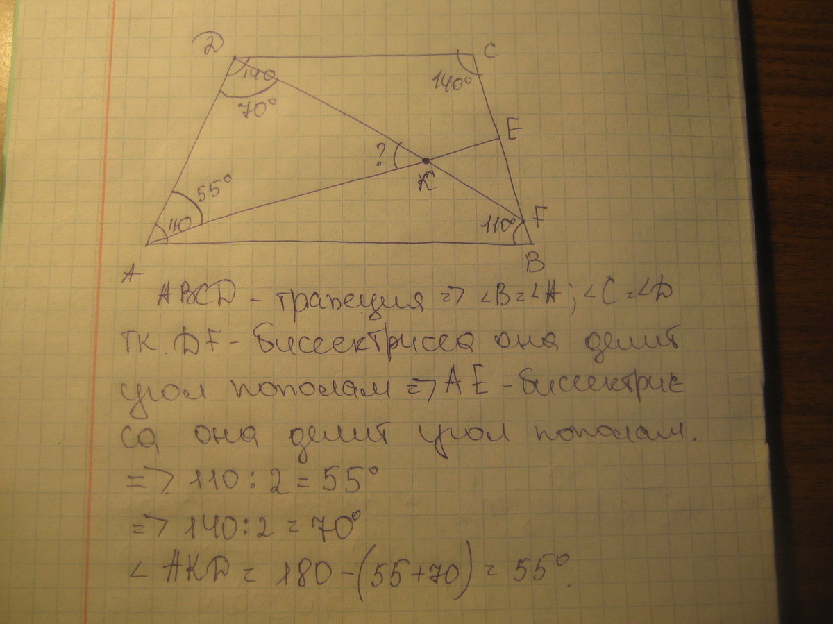 "в трапеции abcd биссектрисы углов a и d пересекаются в точе k принадлежащей стороне bc найдите угол akd если углы b и с равны соответственно 110 и 140"