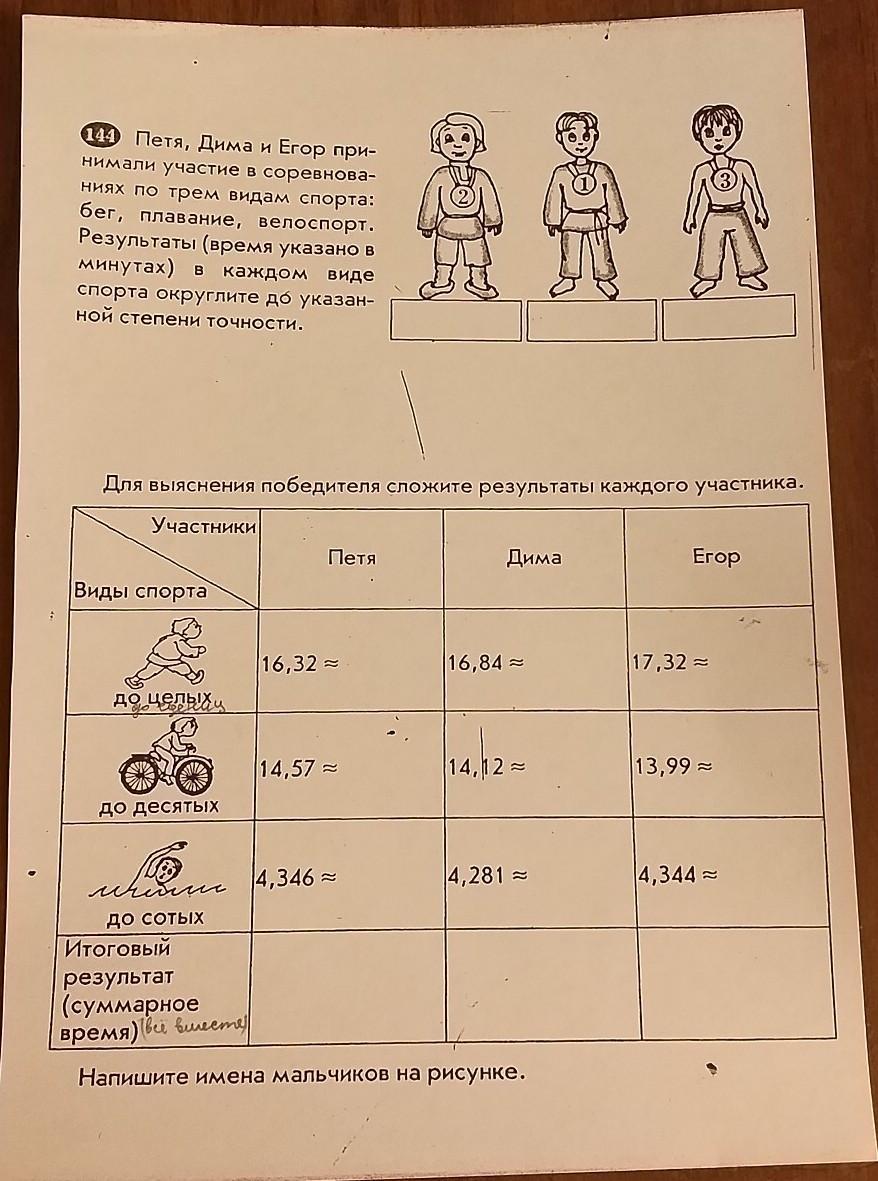 Суммарное время-это сумма всех полученных погрешностей.У Пети:16+14,6+4=34,6;У Димы:17+14,1+4=35,1;У Егора:17+14+4,34=35,34.