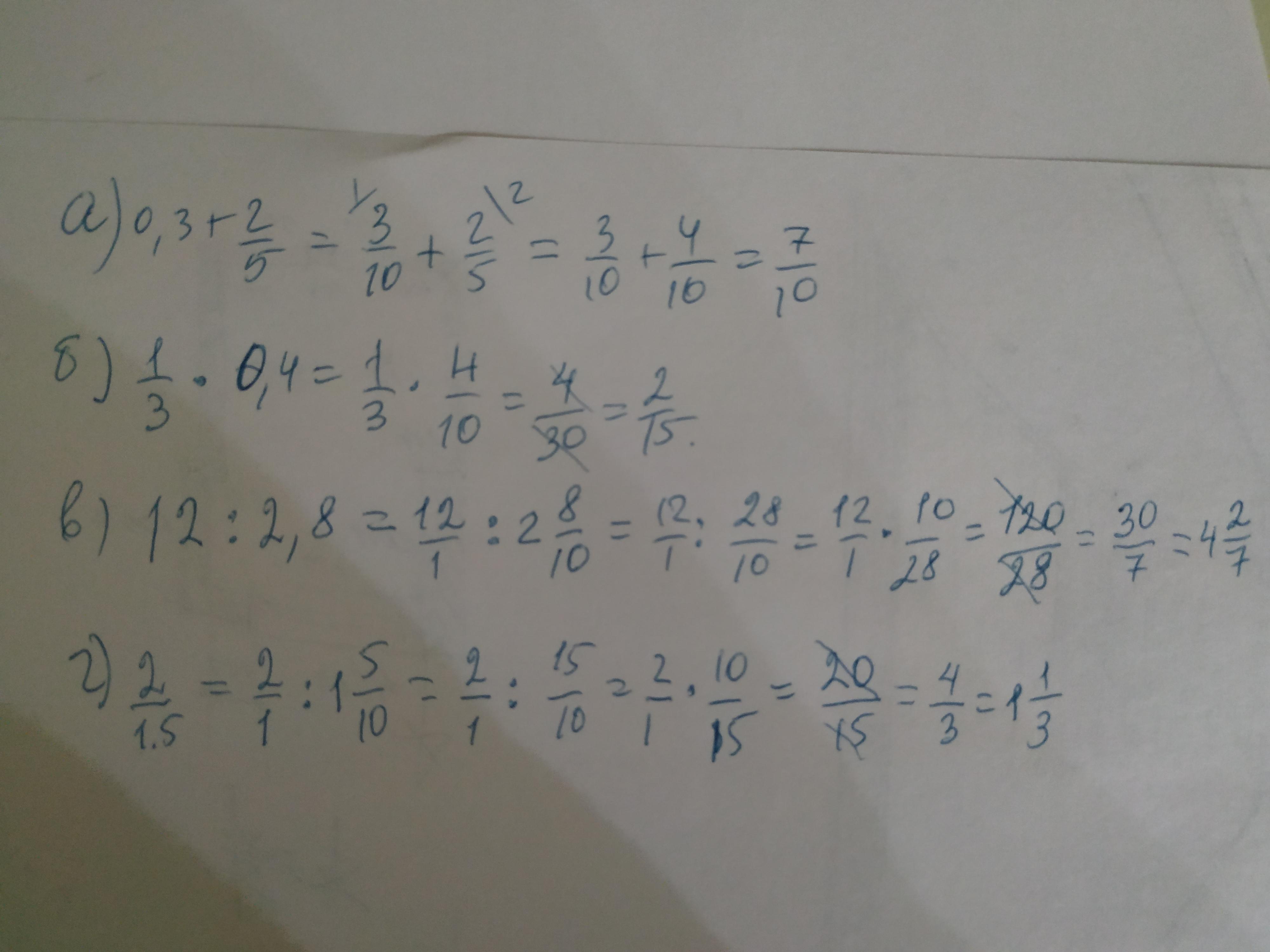 А)0,3 + 2/5 б)1/3 * 0,4 в) 12:2,8 г) 2/1,5