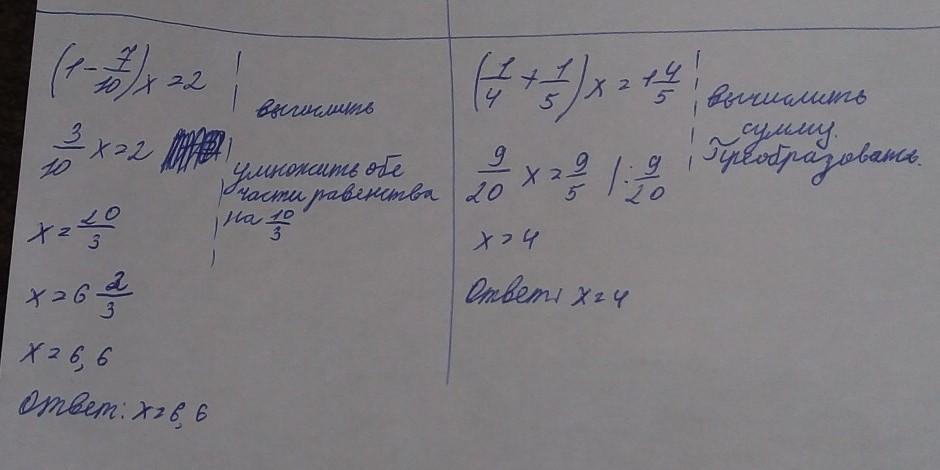 объясните пожалуйста как решать уравнения к примеру :(1-7/10)х=2 1/4;(1/4+1/5)х=1 4/5.даю 15 баллов.