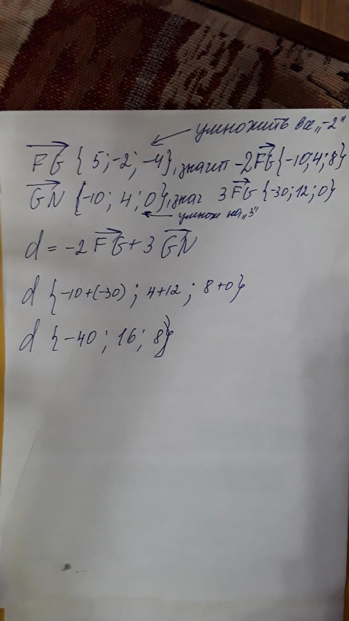 Известно что вектор FG с координатами (5;-2;-4) и вектор GN (-10;4;0)