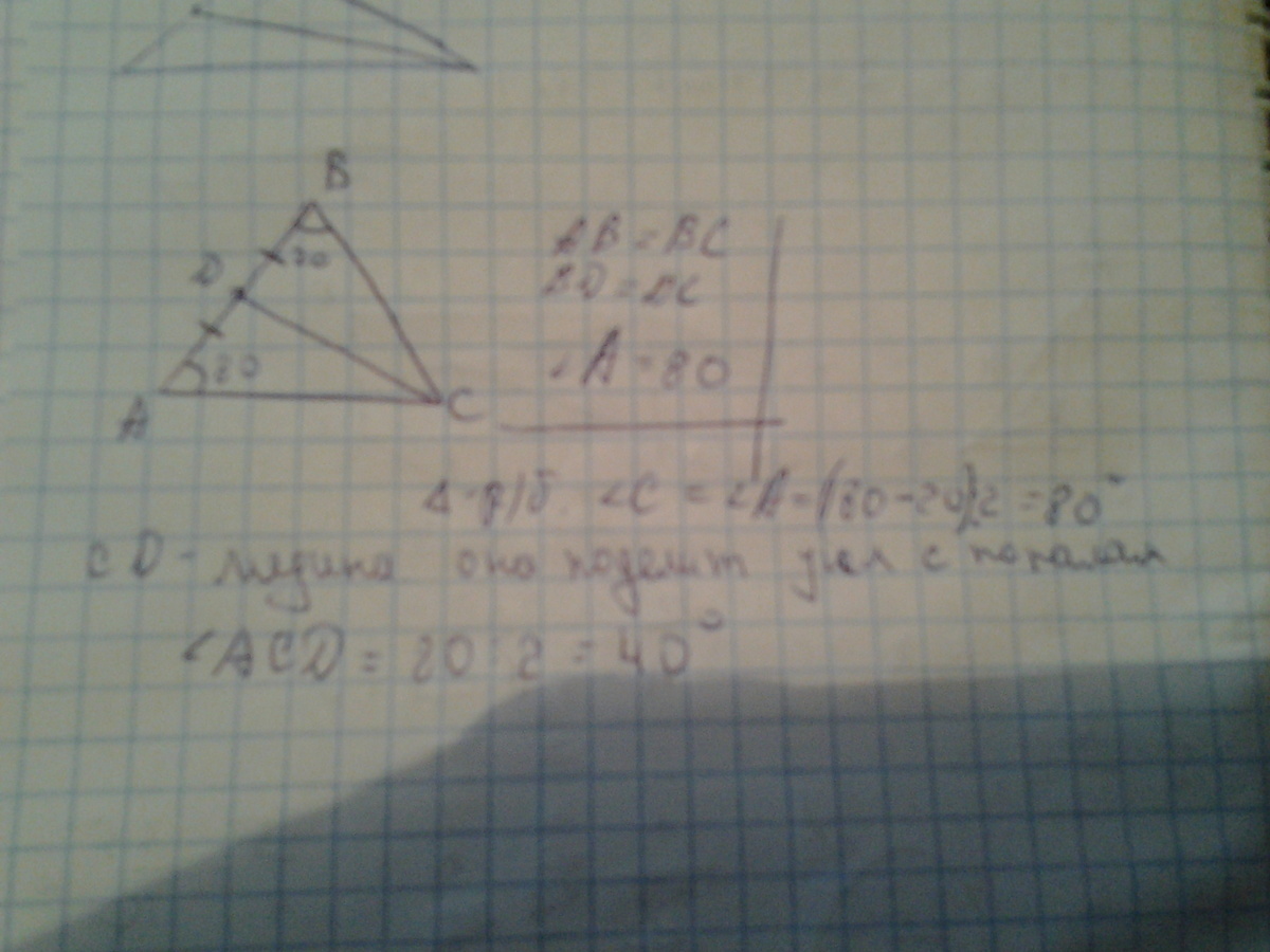 20 градусам. На стороне AB находится точка D, такая, что BD=AC