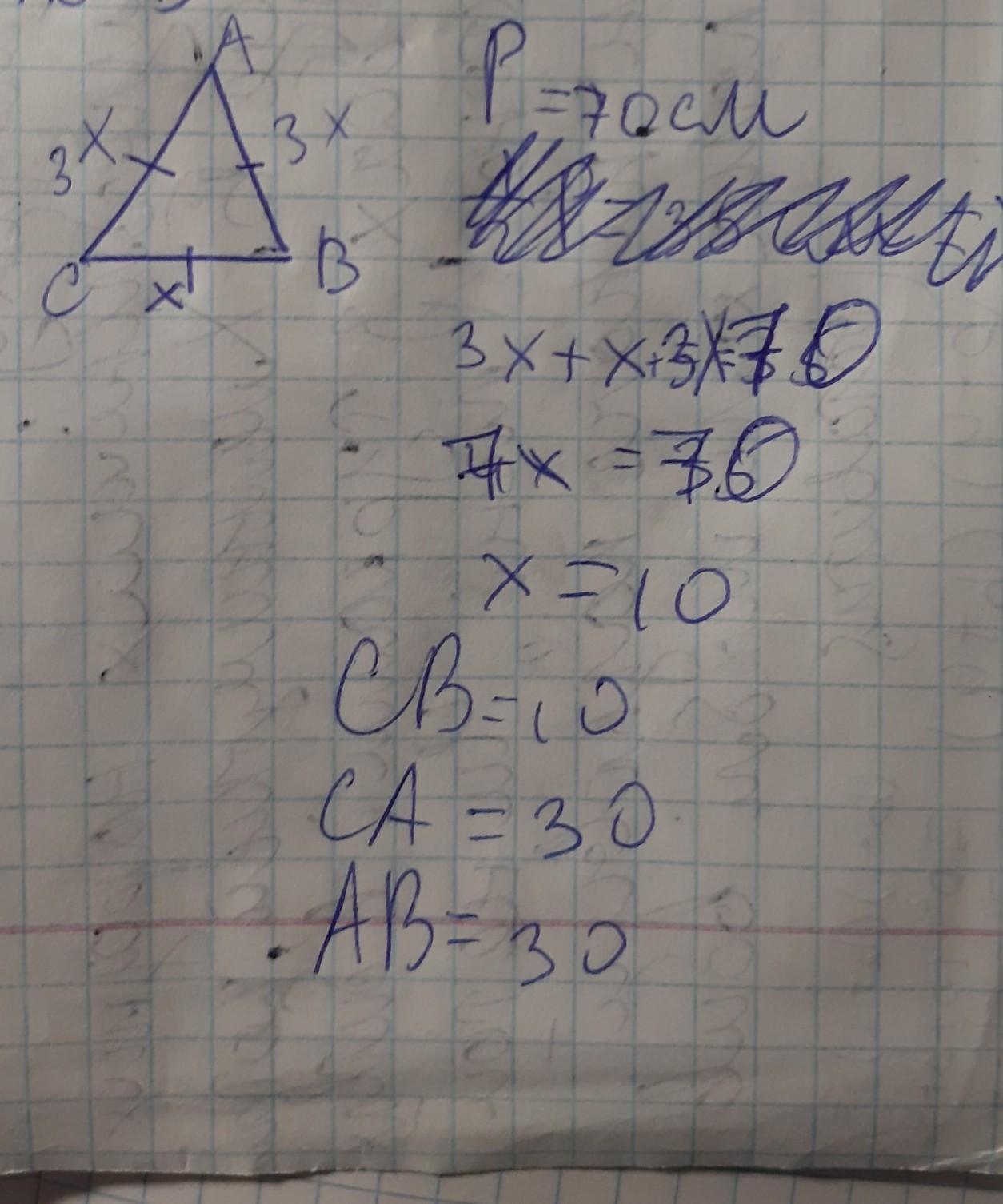 Маємо: ΔCAB,BC=CA Бічна сторона трикутника у 3 рази (-ів) більша від його основи. Периметр трикутника CAB дорівнює 700 мм . Обчисли сторони трикутника:BA,BC,CA
