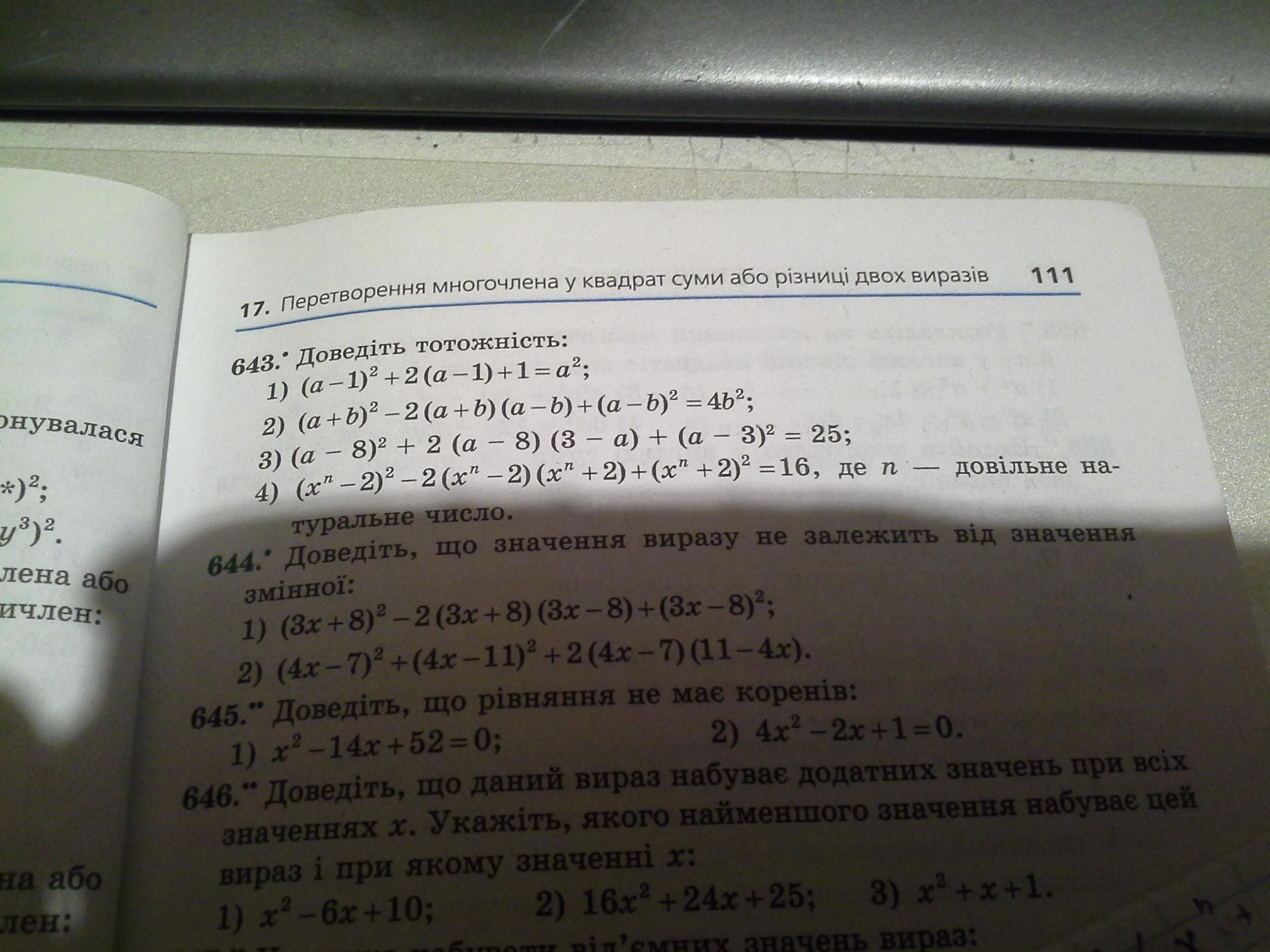 Заранее извиняюсь за почерк) И кстати, на счёт четвёртого не уверена, тождество решила, но не знаю можно ли то, что я там написала (вот это-пусть х=... и так далее)