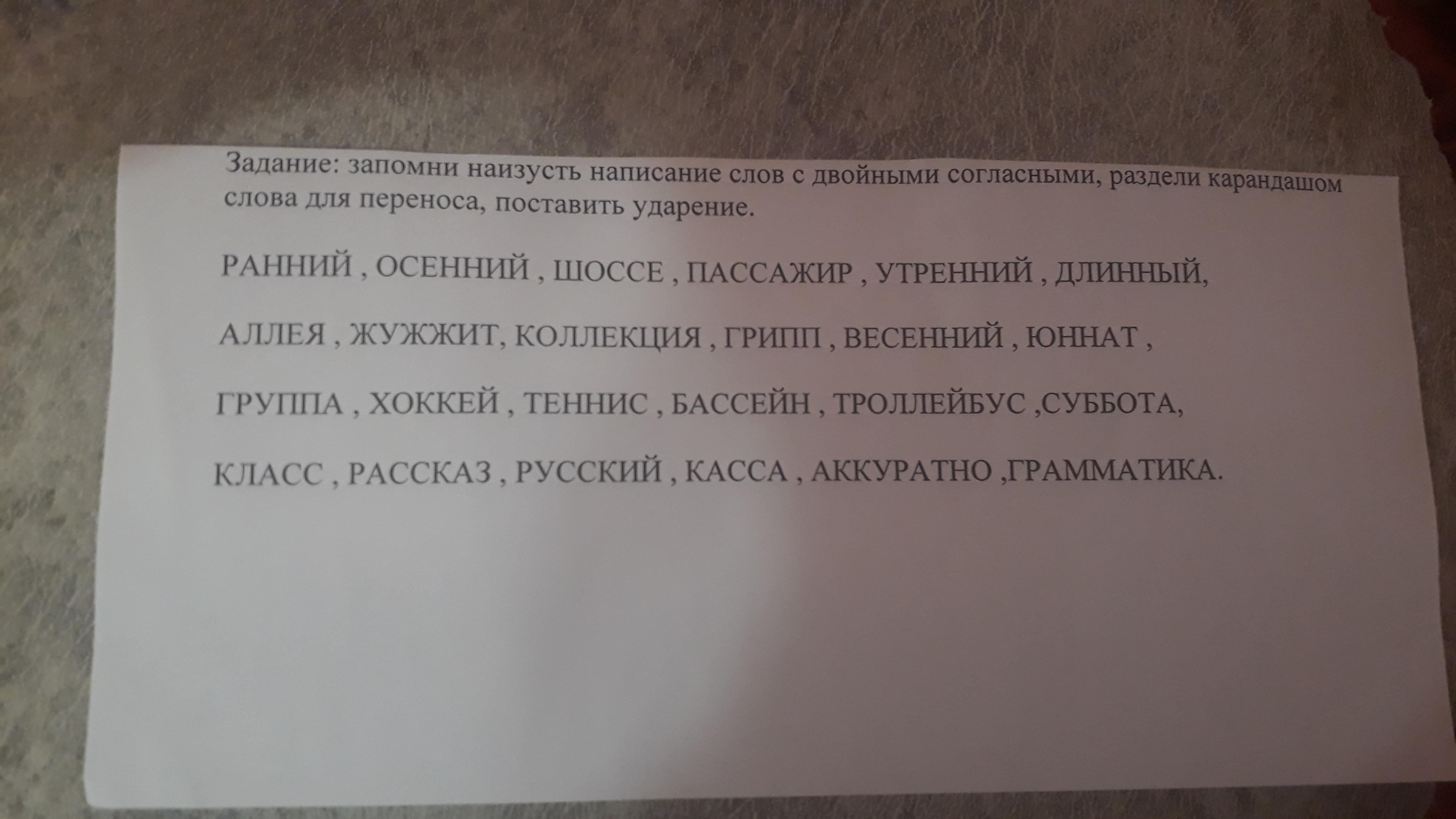Задание: Запомни наизусть написание слов с двойными согласными , раздели карандашом слова для переноса , поставить ударение