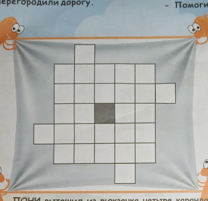 раздели фигуру по линиям сетки на 4 одинаковые по форме и размеру части все части Выдели цветными карандашами на рисунке