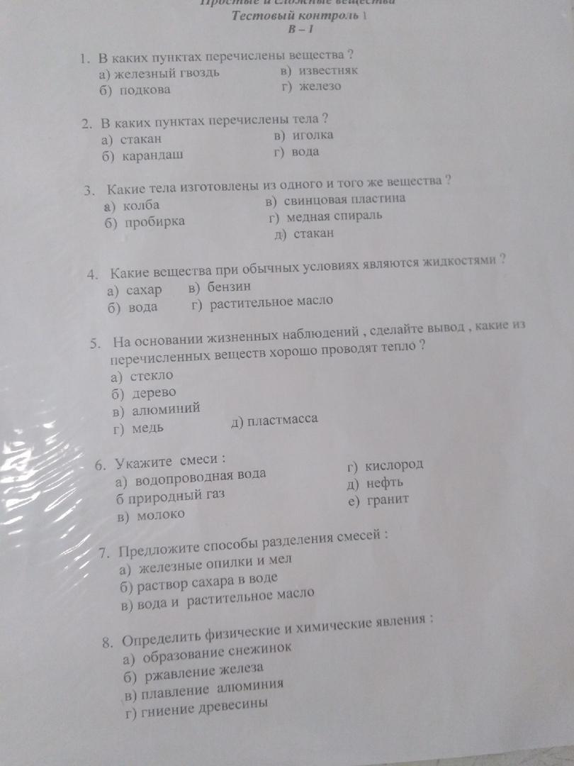 1) в, г. 2)а, б, в. 3)а,б,д. 4)б,в,г. 5)в,г. 6)а,б,в,д,е 7) а - магнитом, б - выпаривание, в-отстаивание 8) Физические -а,в. Химические - б,г